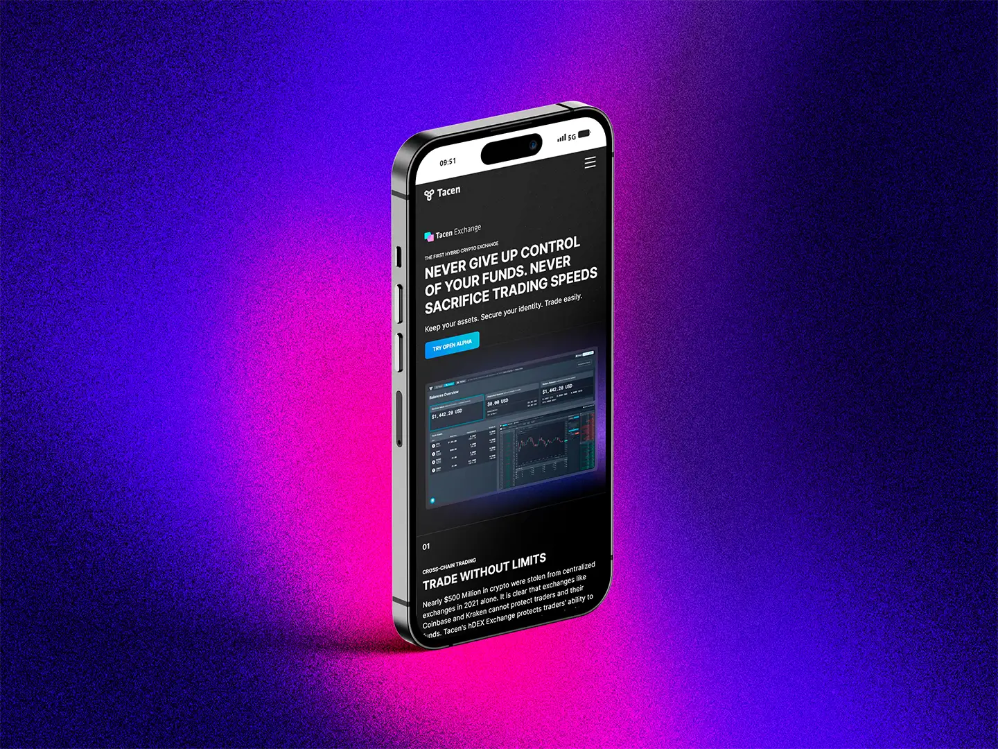 The exchange page provides detailed information about Tacen's hybrid crypto exchange, which offers non-custodial, cross-chain trading. The page explains how the exchange provides maximum control over digital assets while keeping them secure at all times. Tacen's decentralized settlement with a centralized order book ensures fast, secure, and efficient transactions, giving users complete control over their digital assets across all chains at once.