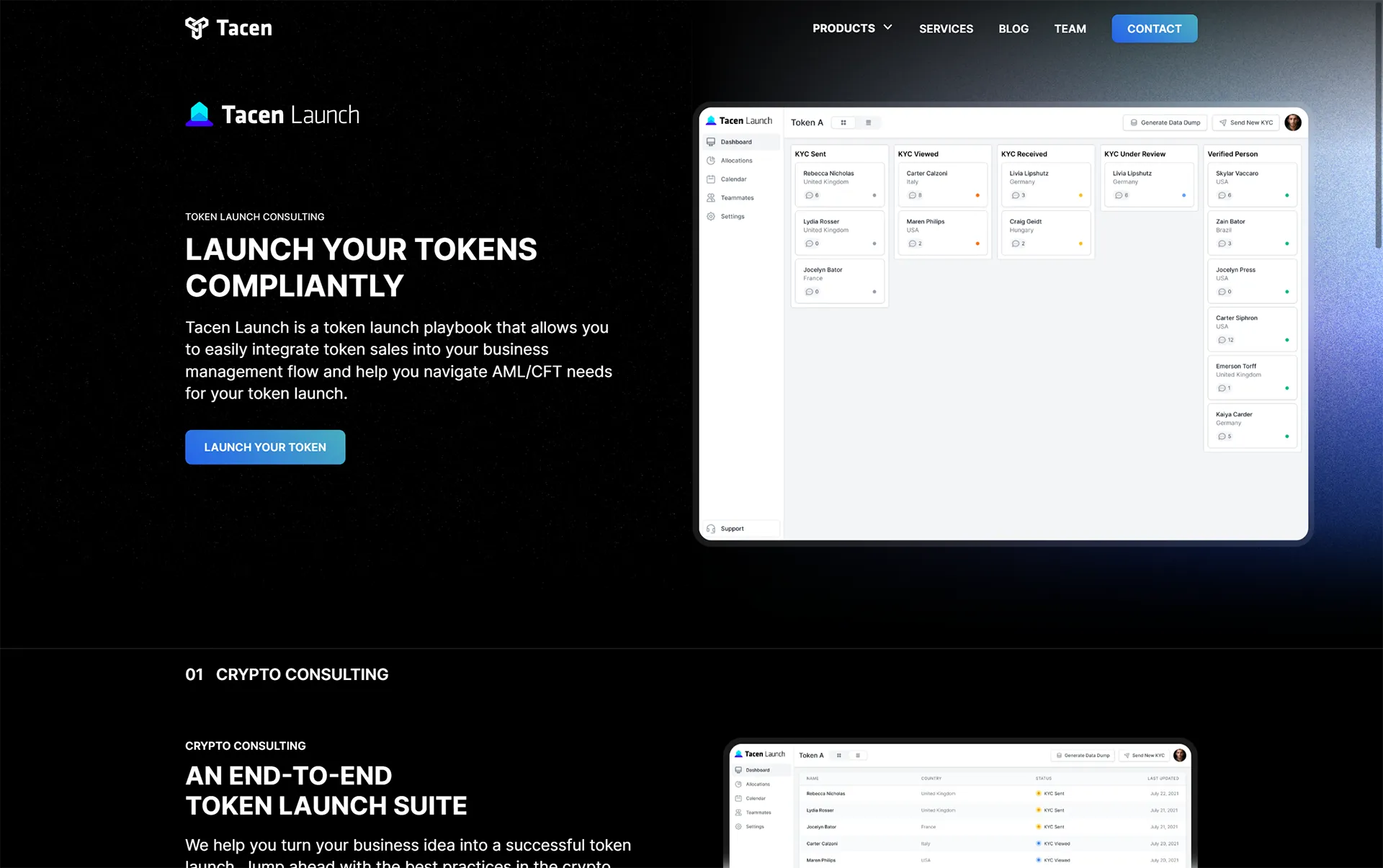 The launch product page offers a full suite of consulting services, guiding token projects from idea to launch. Tacen Launch provides token deployment, token distribution, entity setup best practices, tokenomics, treasury management, and more. Their sales team can tailor the perfect plan to fit the token project's needs.